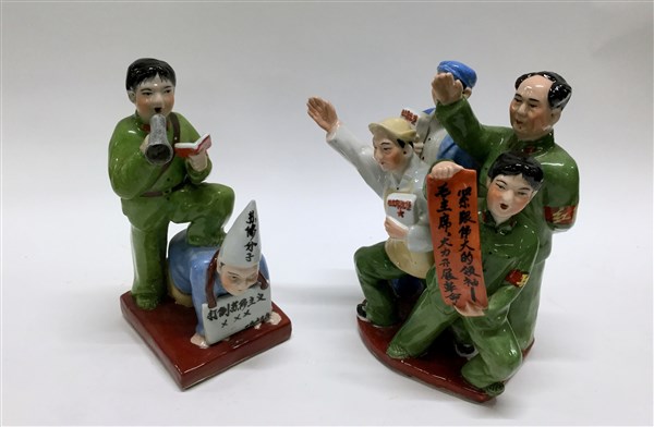 Due gruppi in porcellana policroma raffigurante Mao Zedong e guardie dell'Armata Rossa con iscrizioni di propaganda e datati 1969. Cina, sec. XX
