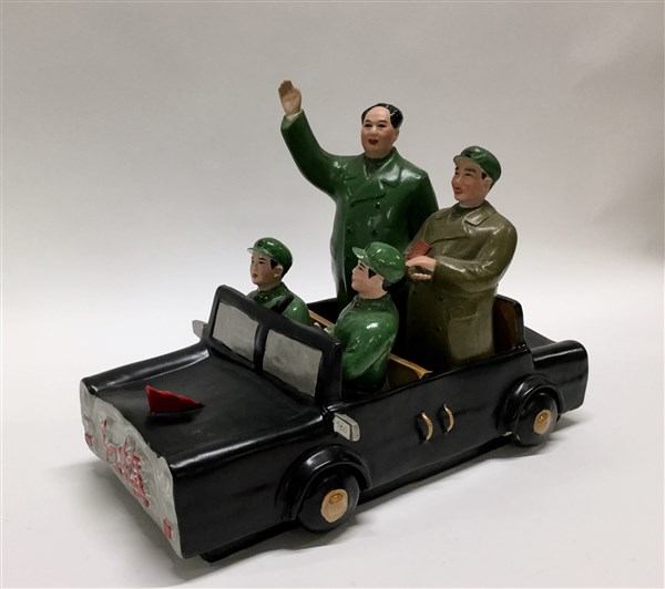 Gruppo in ceramica policroma raffigurante Mao Zedong su una macchina di rappres