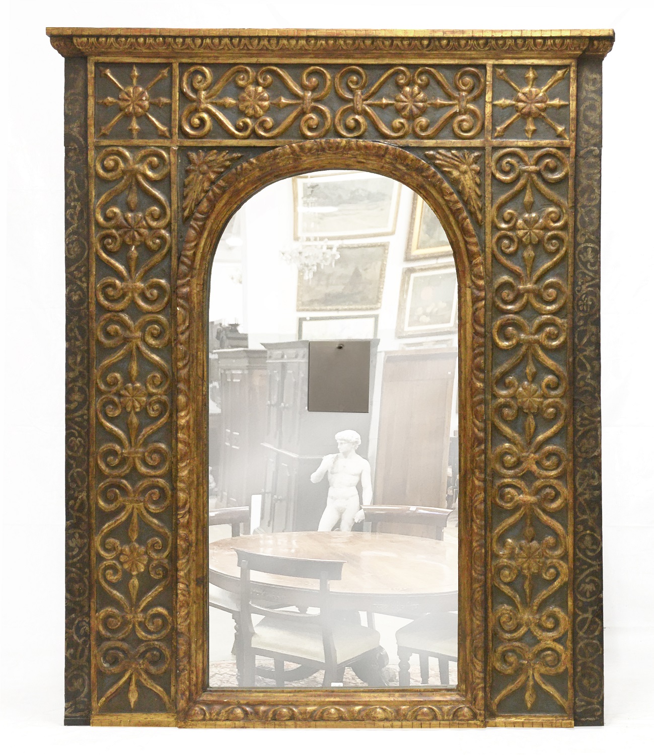Antica specchiera in legno laccato e dorato con cornicione aggentante (cm 140x180) (difetti)