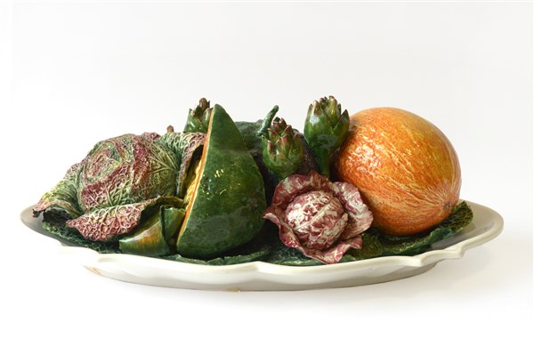 Centrotavola in ceramica decorata in policromia a rilievo a verzure (l cm 57) (