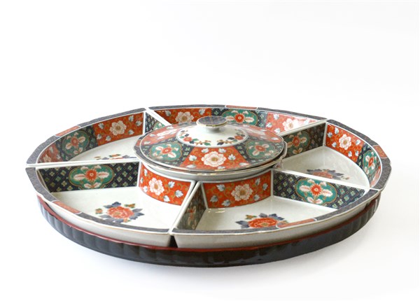 Antipastiera composta da cinque vassoi ed uno centrale con coperchio in porcellana nei toni del rosso, blu e verde con motivi floreali, con vassoio laccato in rosso e nero (d. cm 46). Giappone, manifattura moderna