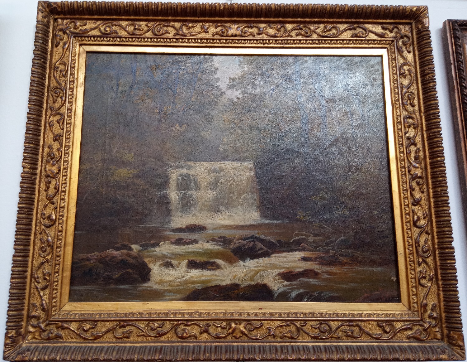 Firma indecifrata "Paesaggio con cascata" 1879, olio su tela (cm 43x55) Firmato e datato in basso a destra. In cornice (lievi difetti)
