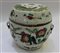 Manifattura orientale, contenitore con coperchio in ceramica dipinta a decori naturalistici (h cm 16, diametro cm 17) (difetti)
