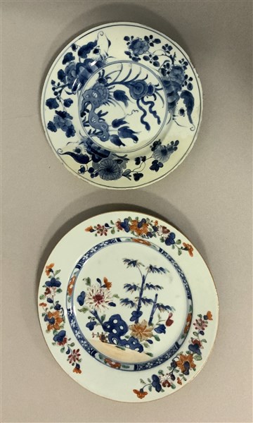 Due piatti in porcellana a motivi floreali, uno a decoro bianco e blu, l'altro Imari e Famiglia Rosa (d. max cm 23) (restauri)