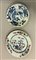 Due piatti in porcellana a motivi floreali, uno a decoro bianco e blu, l'altro