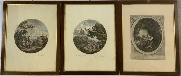 Lotto di tre incisioni a colori del secolo XIX raffiguranti paesaggi con scene di genere, in cornici (cm 63x48) (difetti)