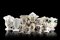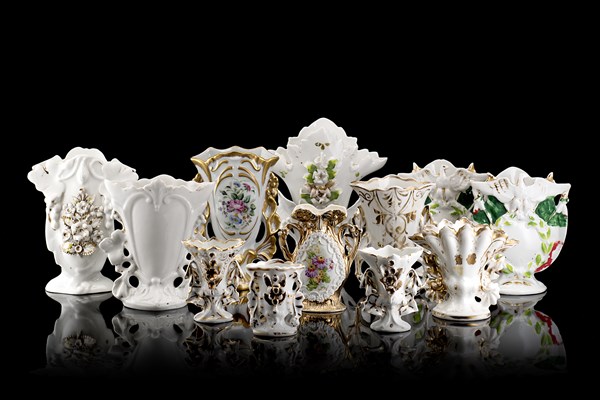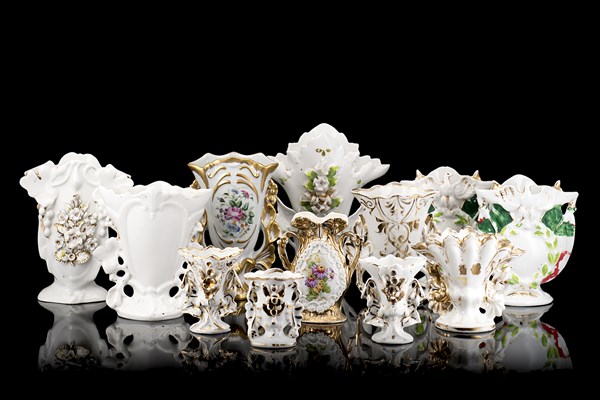 Manifattura francese, secolo XIX. Gruppo di dodici vasi in porcellana decorati