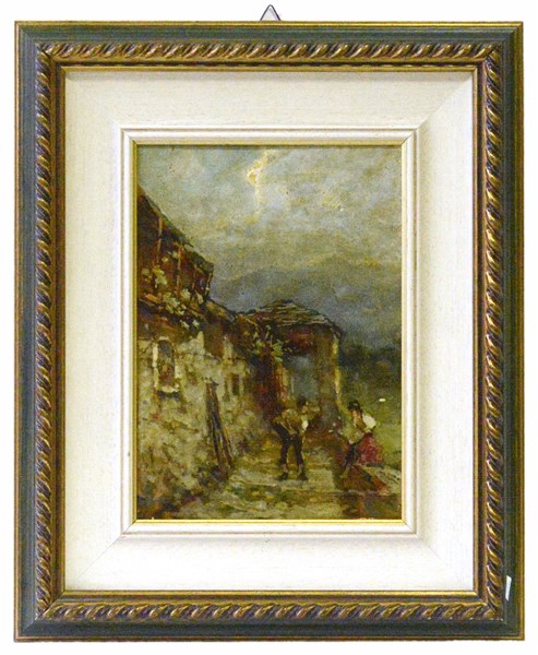 Firma indecifrata "Scorcio con montagna" olio su cartone (cm 27x19) Siglato in basso a destra. In cornice (difetti)