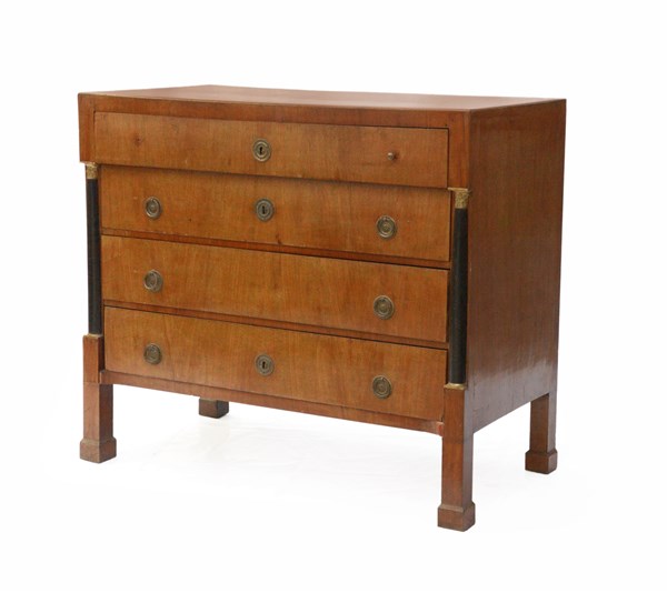 Comò lastronato in noce a quattro cassetti con mezze colonne ebanizzate e piedi a plinto. Secolo XIX (cm 119x104x61) (difetti e mancanze)