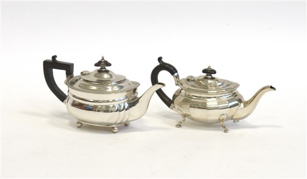 Lotto composto da due teiere in argento a corpo liscio con anse e prese ebanizzate. Marchi inglesi (g lordi 700 ca.) (lievi difetti)