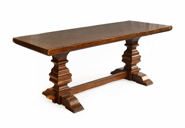 Tavolo di forma rettangolare con gambe a colonna sagomata riunite da traversa d
