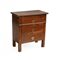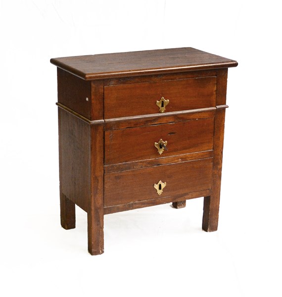 Antico comodino in legno con fronte a tre cassetti. Piedi squadrati (cm 68,5x76