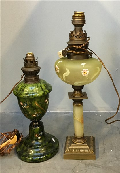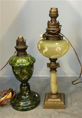 Lotto di due lampade da tavolo di manifatture differenti, vetro, onice e raccordi in metallo (h max cm 40) (difetti)