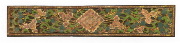 Pannello in legno intagliato e laccato in policromia a fiori e foglie (cm 196x35) (difetti)