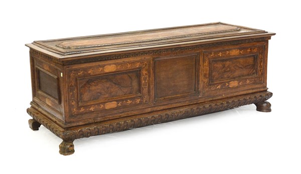 Antica cassapanca con fronte pannellato ed intarsiato in legni vari a volute, fasce e gambe intagliate (cm 176x 63x58) (difetti)