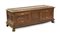 Antica cassapanca con fronte pannellato ed intarsiato in legni vari a volute, f