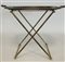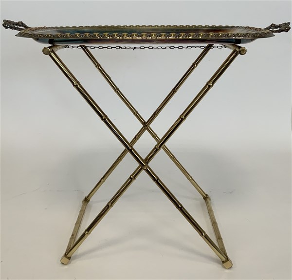Vassoio biansato in metallo argentato sbalzato e decorato a motivi stilizzati. Con trespolo in metallo argentato (difetti)