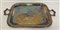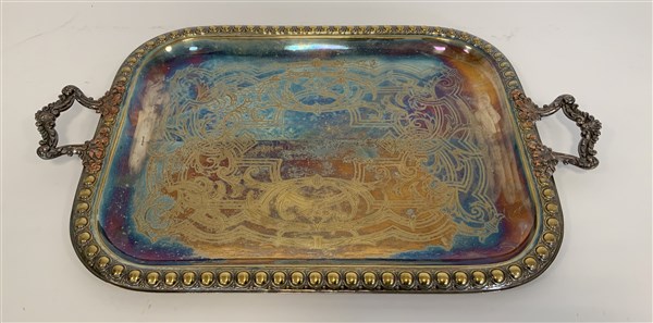 Vassoio biansato in metallo argentato sbalzato e decorato a motivi stilizzati.