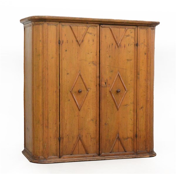 Antico armadio in legno dolce con angoli arrotondati, due sportelli incorniciati e decorati con rombi (cm 184x184x75) (difetti e restauri)