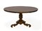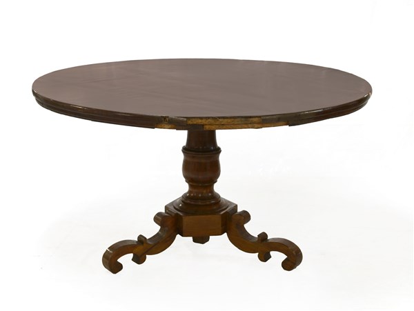 Tavolo con piano tondo lastronato, sostegno centrale a colonna tornita su piedi sagomati a doppia voluta. Inghilterra, secolo XIX (d. cm 144 x h. cm 80) (difetti e mancanze)