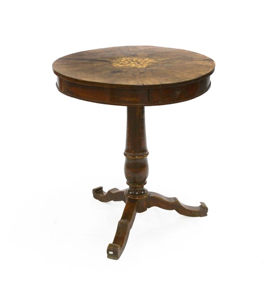 Tavolo da salotto con piano tondo lastronato in noce e intarsiato al centro a volute. Cassetto sottopiano e gamba centrale tornita poggiante su tre piedi. Secolo XIX (cm 86x82) (difetti e restauri)