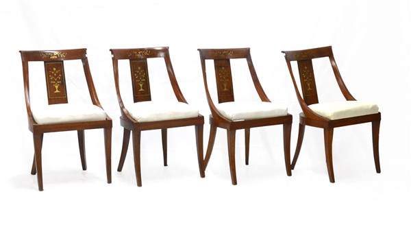 Gruppo di quattro sedie a gondola con schienale e cartella intarsiati in ottone, gambe a sciabola. Secolo XIX (difetti e restauri)