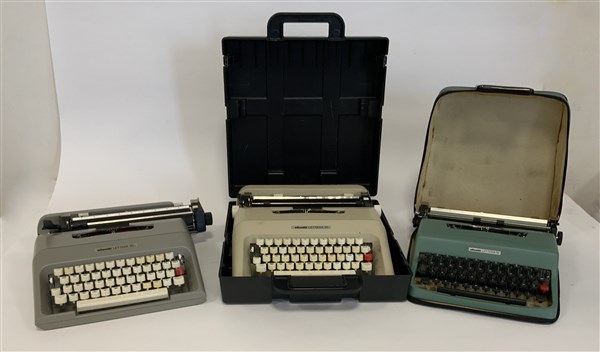 Tre macchine da scrivere Olivetti di modelli ed epoche diverse (difetti)