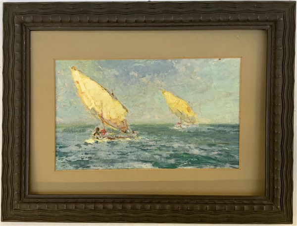 Firma indecifrata "Marina con barche" olio su cartone (cm 16x26) Siglato in basso a destra. Al retro: iscrizione. In cornice (difetti)