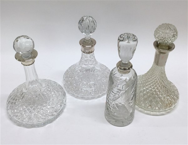 Lotto di quattro bottiglie in cristallo con ghiera in argento e metallo (lievi