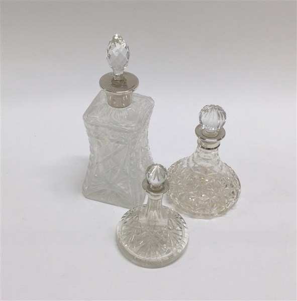 Lotto composto da tre bottiglie in cristallo con ghiera in argento e metallo (l