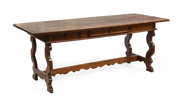 Tavolo di forma rettangolare a tre cassetti sottopiano, gambe e traverse a lira