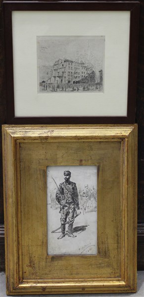 Lotto composto da un disegno di Matania a china raffigurante soldati, firmato e datato '96, e un'incisione raffigurante la demolizione del quartiere Rebecchino di Milano. Misure diverse, in cornici