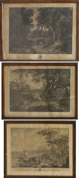 Lotto di tre incisioni del XVIII secolo raffiguranti paesaggi, in cornici