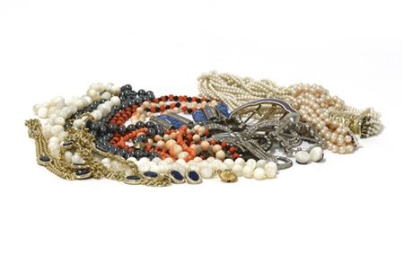 Scatola contenente bigiotteria varia e alcune fibbie in strass (difetti e mancanze)
