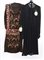 Lotto composto da due vestiti: uno nero in chiffon a maniche lunghe con gonna plissé soleil e corpino liscio, piccola cintura in vita, due gardenie ricamate una sulla manica e una sul decolté, l'altro senza maniche in maglina marrone interamente ricamato con fiori e uccelli del paradiso nei toni del rosa e beige. (tg. 40/42) (segni d'uso)