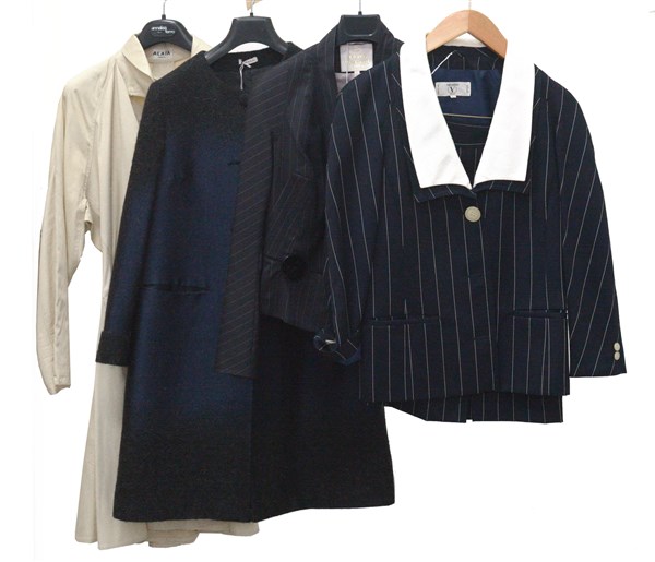 Lotto composto da giacchino gessato blu con grandi bottoni logati, un trench con cintura color crema, completo, giacca e gonna, gessato blu con collo bianco, cappottino in misto lana sfumato dal nero al blu (tg. 40/42)