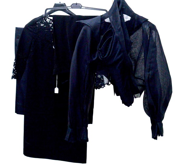 Lotto composto da bolero in chiffon di seta, pantalone in seta, abito cocktail con pizzo sul décolleté e sulla manica, top in cachemire e seta con coppe e pantalone tutto sui toni del nero (tg. 40/42)