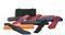 Lotto di cinque cravatte con scatole, di forme colori e materiali differenti, unite ad un portacravatte da viaggio in pelle verde (segni d'uso)