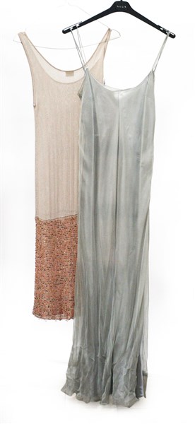 Lotto composto da due abiti, uno a canottiera color ecrù rifinito sul fondo da perline sui toni del rosa, beige e marrone e l'altro in raso e chiffon sui toni del grigio (tg. 38/40)