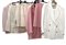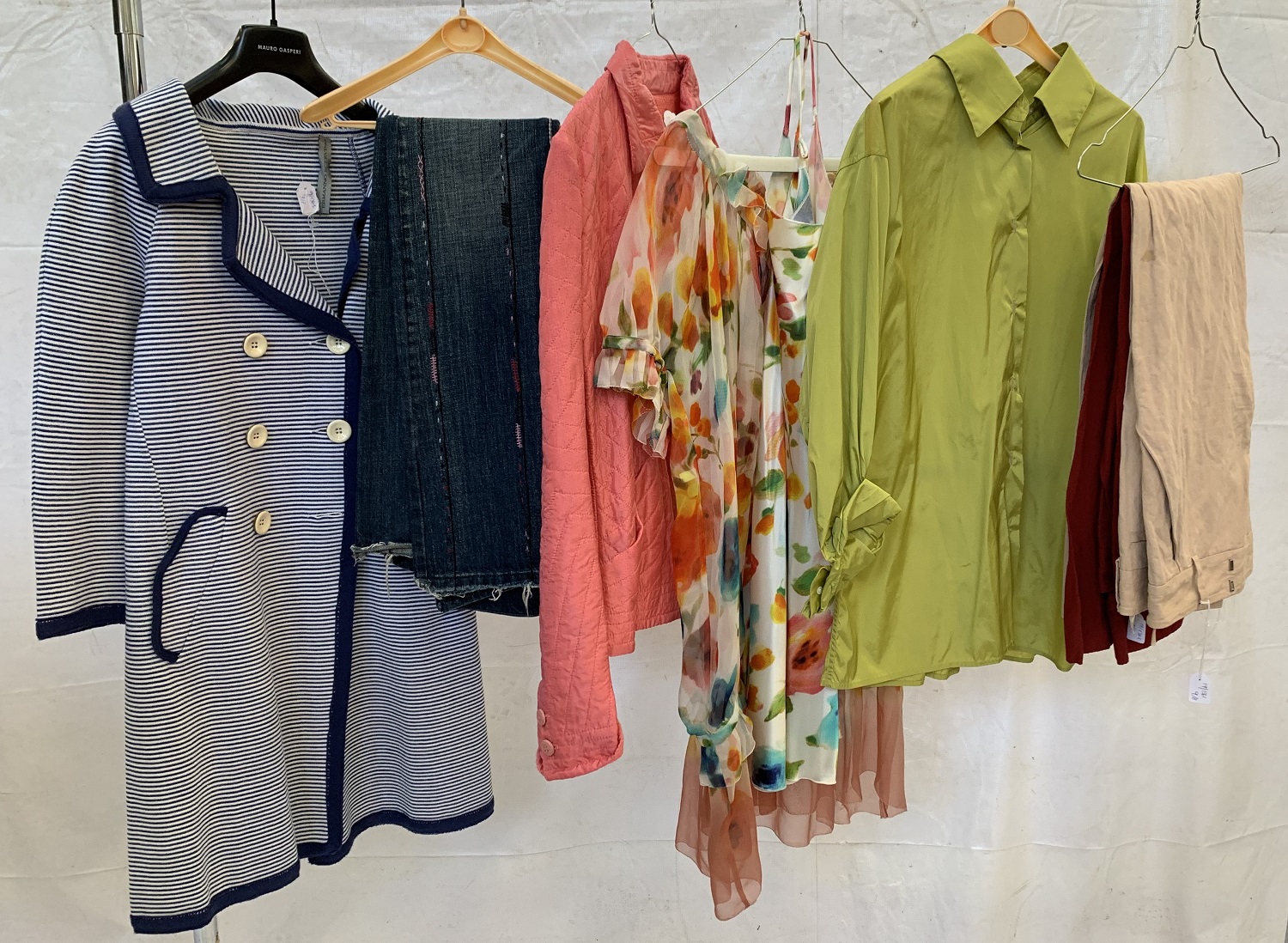 Lotto composto da un cappottino marinaro bianco/blu con lamé, giacca trapuntata rosa, camicia verde lime, due paia di pantaloni, uno rosso e uno cipria, un paio di jeans con cuciture bianche, nere e rosa e un completo, camicia con abito sottoveste, multicolor (tg. 40/42)