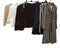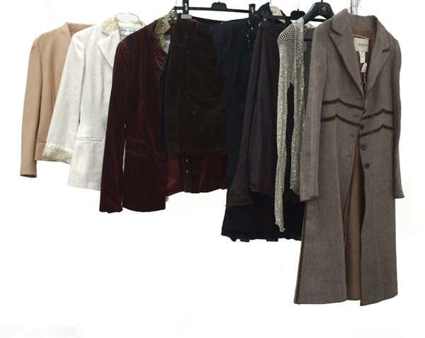 Lotto composto da un cappottino in juta melange marrone, un completo maglia con gonna marrone e una gonna con golfino smanicato con collo a lupetto nero, due gonne in velluto, una giacca a righe nei toni del ruggine con collo coreano, due tailleur e un cardigan a rete color avorio/argento (tg. 40/42) (difetti e segni d'uso)