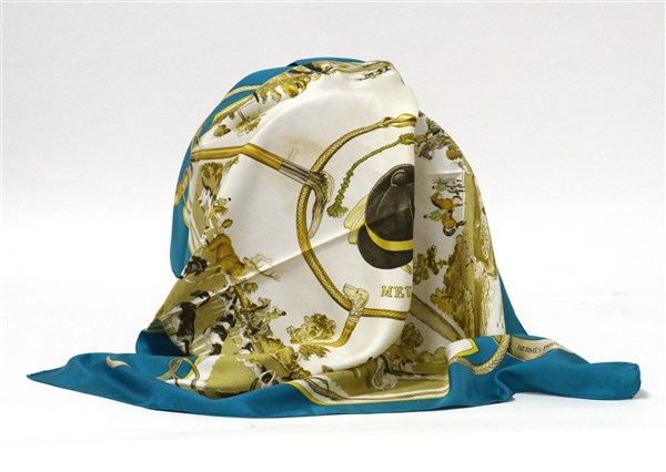 HERMÈS Foulard in seta "Meutes", Philippe Ledoux 1971, fondo avorio bordo verd