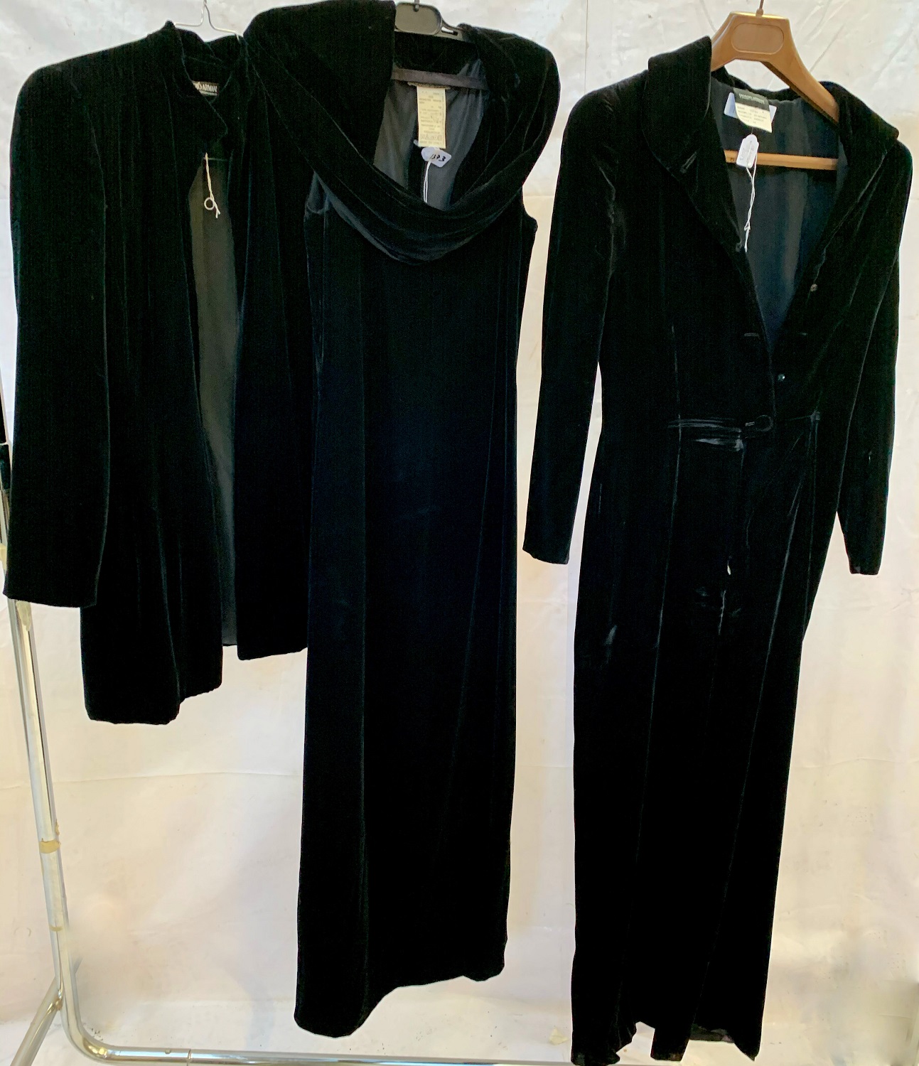 Lotto composto da un abito lungo con collo sciallato, un cappottino con collo alla coreana e una tuta in velluto nero (tg. 40/42)da donna