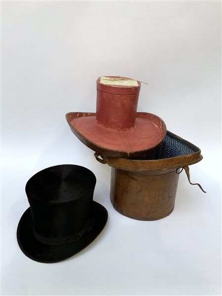 Cappello a cilindro in cavallino nero marcato Christys Best London in bella custodia originale in cuoio (difetti e mancanze)