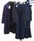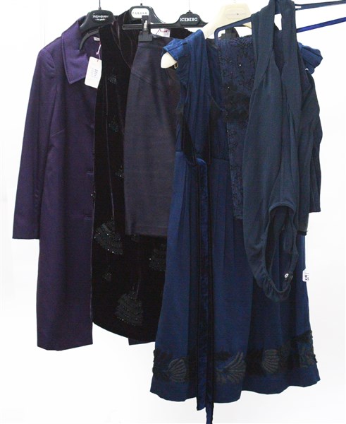 Lotto composto da jeans ricamati con jet e tessuto nero, abito cocktail senza maniche blu con ricami in rilievo sui toni del nero e del grigio, abito in velluto color melanzana senza maniche con applicazione di jet in rilievo e cappottino misto seta sui toni del melanzana, gonna in pelle viola e body in cotone blu (tg. 40/42)