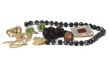 Lotto composto da collier con perle fancy nere, strass con centrale a forma di testa di leone, spilla a grappolo d'uva in jet nero orecchini pendenti con strass, lunga catena con perle fancy e pendente a forma di boccetta per profumo, spilla quadrata con strass incolori e arancio, orecchini a lobo con paste vitree verdi e strass e infine un anello bombato con strass color glicine e pietra centrale color arancio, tutto in metallo dorato (difetti e mancanze)