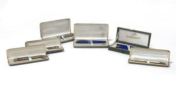 Lotto composto da sei confezioni contenenti 7 fra penne, matite, biro e stilografiche di cui alcune in argento (leggera ossidazione)