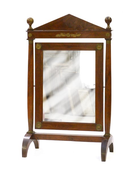 Psiche da terra in noce con montanti a colonna tornita, fregi in metallo dorato, pinnacoli a sfera fine secolo XIX (cm 94x150x45) (difetti)