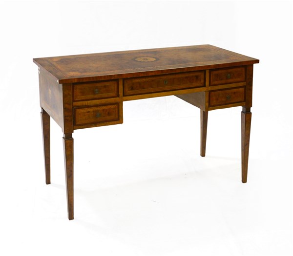 Scrivania lastronata in noce e radica, intarsiata e filettata con fronte a cinque cassetti, gambe troncopiramidali (cm 121x80x60) (difetti)