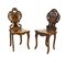 Due sedie in legno di forma sagomata con schienale a giorno intagliato a volute e stelle alpine e intarsiate a motivi di stambecchi, cervi e scena di montagna, misure diverse. Una con seduta apribile contenete carillon. Foresta Nera, inizio secolo XX (difetti)